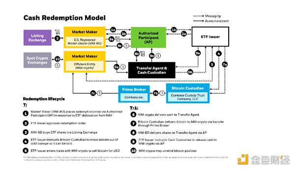 当授权参与人(AP)想要购买(创建)ETF 新股以履行交易订单时,现金流创造要求发行商从授权参与人(AP)那里接收现金。请注意,AP 是代表经纪商(BD)的散户投资者(你我)执行交易的经纪商,SEC 和 FINRA 都没有批准这些经纪商交易现货比特币资产。