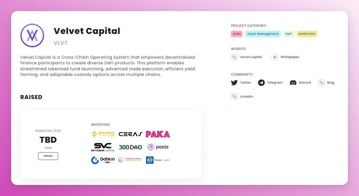 Velvet Capital 是一个跨链操作系统,赋能去中心化金融参与者创造多样化的 DeFi 产品。 Velvet Capital 的 TVL 已达 120 万美元。