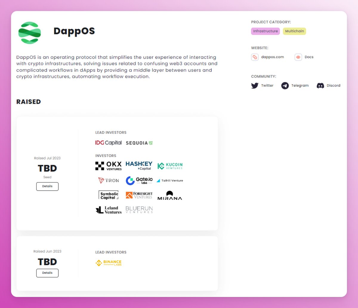 DappOS 是第一个以意图为中心的操作协议,旨在使 dApp 像移动应用程序一样用户友好。除 Binance Labs 外,投资者还包括红杉资本中国、HashKey Capital 等。