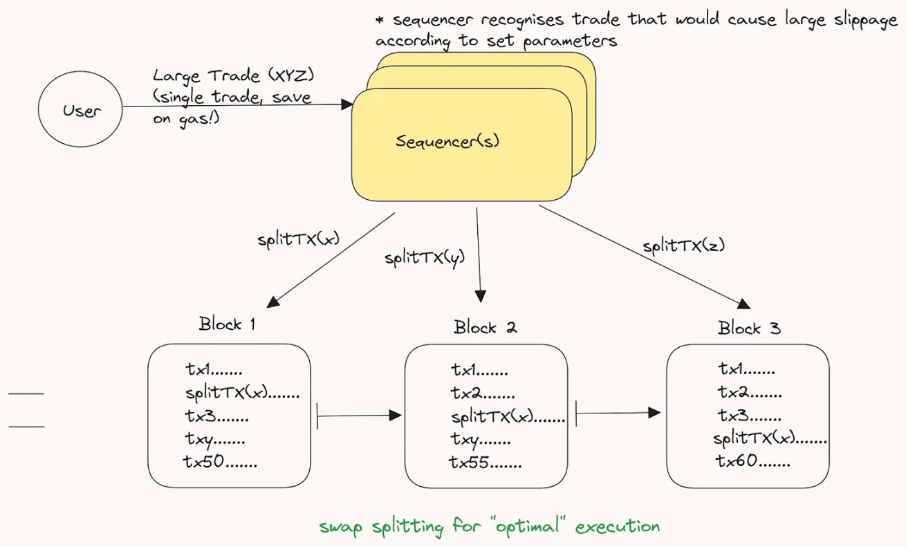 另一个可能的想法是交易分割。设想有一个交易池,如何执行大订单交易(这会导致大量滑点)?如果此交易跨连续区块执行(或者如果符合 VSR,则在区块最后执行),这对终端用户公平吗?