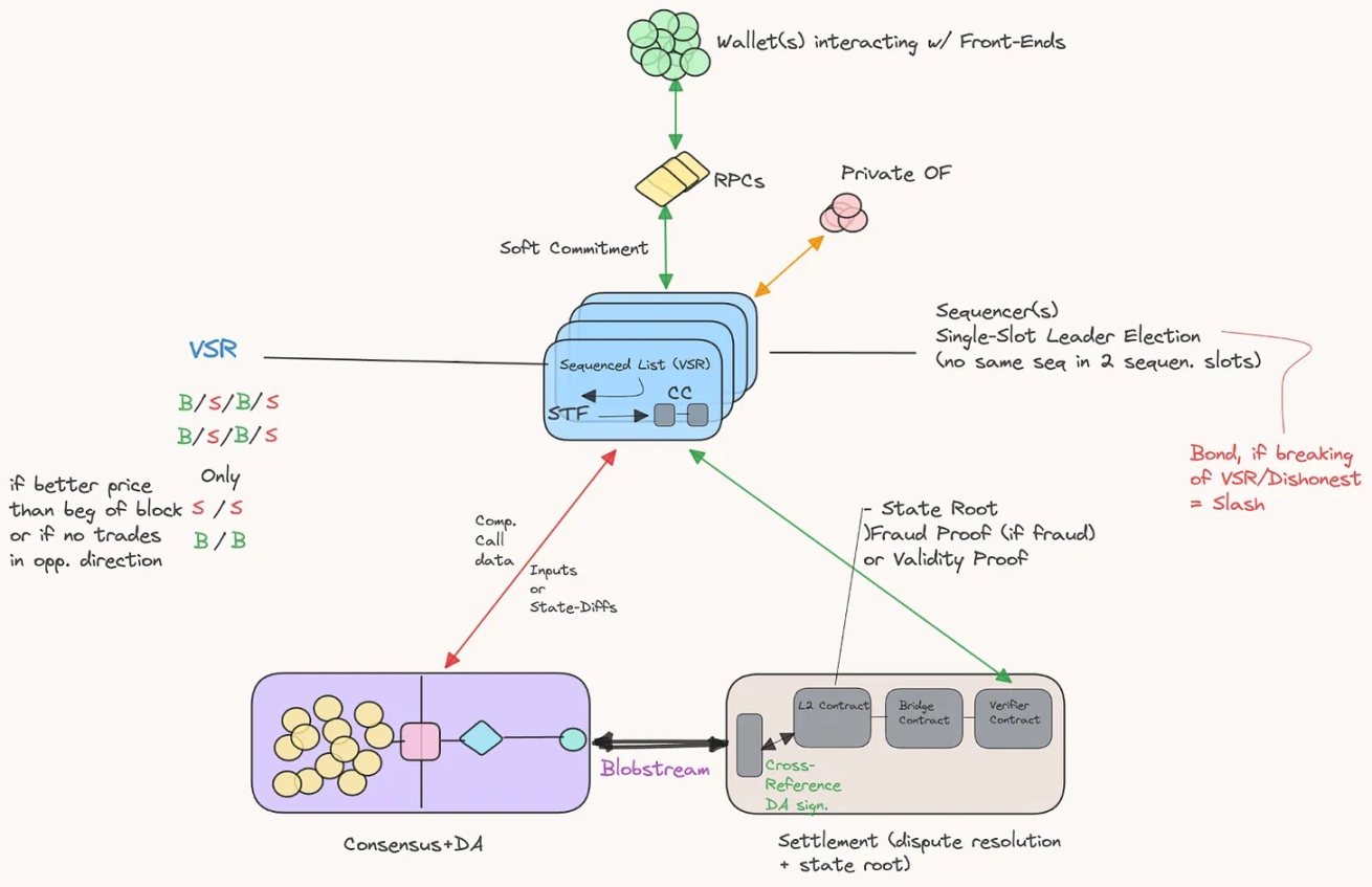 此外,将优先费 Gas 战争与链外结构分离,可以将 MEV 提取隔离到执行环境中,从而有助于遏制供应链中断。然而,考虑到如果领导者选举发生在 Rollup 上,则大多数 MEV 将在 Rollup 上提取,这给底层结构留下很少的空间,除非 DA 层包含、结算层的优先费用来自流动性整合或其他的规模经济。
