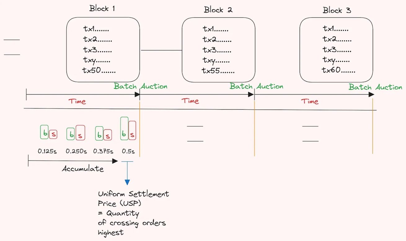 在这种设置中,不存在先到先得或优先 Gas 费战争,而是在每个区块之间的时间内根据累积订单进行区块结束批量拍卖。