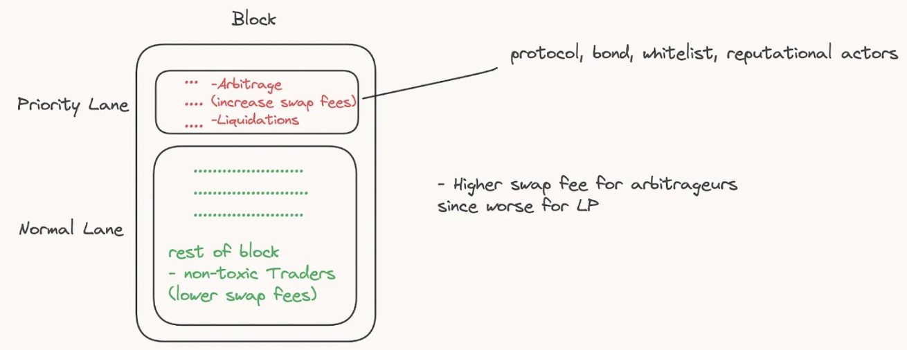 此外,有一些 MEV 很重要,如套利、清算等。一个想法是在区块顶部建立一条「高速公路」通道,专门针对白名单上的套利者和清算人,他们支付更高的费用并与协议分享部分收入。