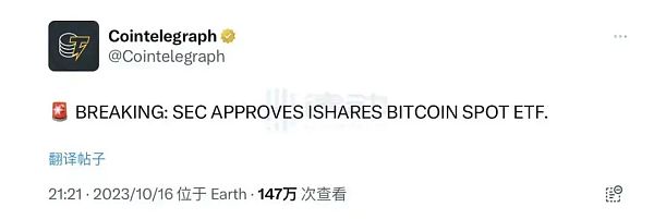 译文:突发事件:美国证券交易委员会批准 ISHARES 比特币现货 ETF。