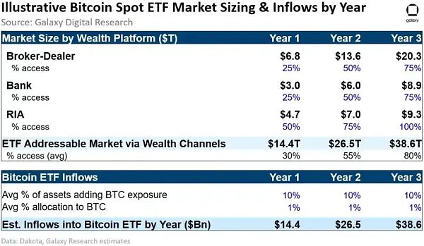 如果假设比特币在每个财富渠道的总可用资产中被 10% 采用,平均配置占比为 1%,那么 Galaxy Digital 报告估计在比特币 ETF 发布后的一年将有 140 亿美元资金流入,到第二年将增加到 270 亿美元,再到发布后的第三年将达到 390 亿美元。