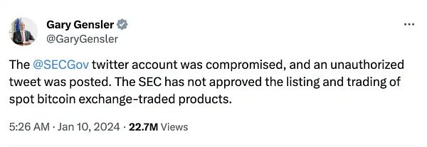 1 月 10 日凌晨,美国 SEC 官方在社交媒体发布消息称比特币现货 ETF 被批准。这条推文流量瞬间百万。情绪积攒到这个时候,配上这条加密货币行业等了数年的新闻,没有任何人会觉得这几行字会有任何问题。