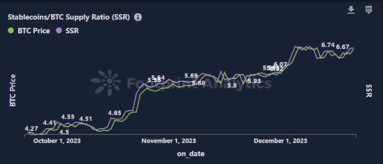 最近几个月,SSR 持续上升,从 10 月 1 日的 4.58 上升到 12 月 21 日的 6.86。这意味着比特币相对于稳定币的市值有所增加。这可能表明市场上对比特币的需求较高,可能会推高其价格。