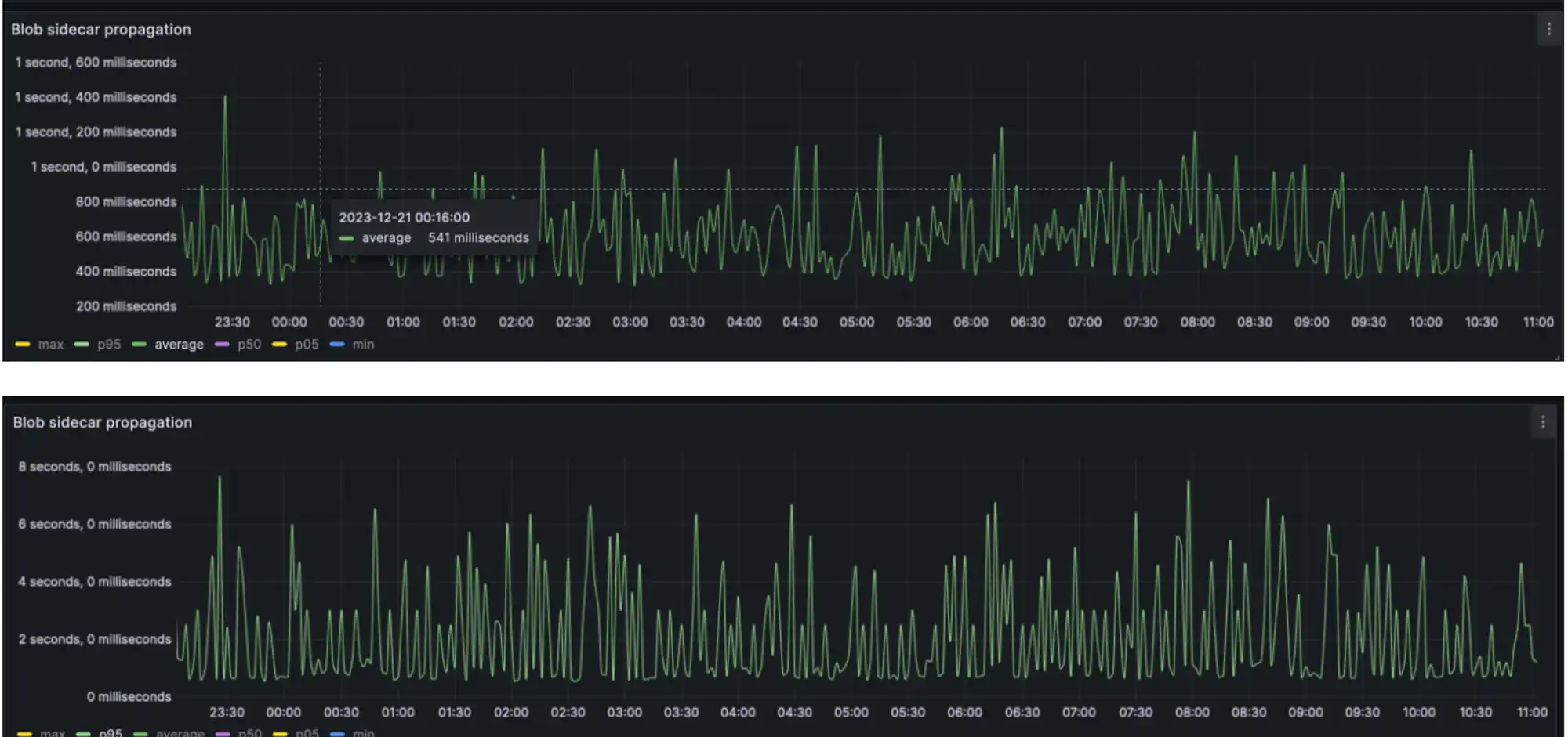 blob 会在小于 2s 的时间内传播到 95% 的节点,平均情况下,大多数 blob 在 500 毫秒内即可通过完整的网络传播。理想情况下,区块的传播时间预计会增加约 250 毫秒。