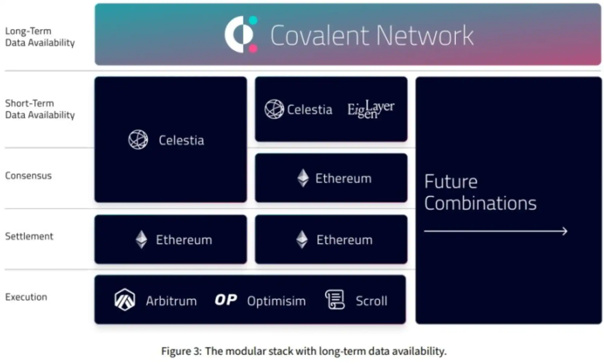 无论在模块化区块链的未来,执行层、结算层、共识层以及短期数据可用性层如何演绎,Covalent 都希望成为所有项目方的长期数据可用性层,提供永久的数据存储以及可用性服务。