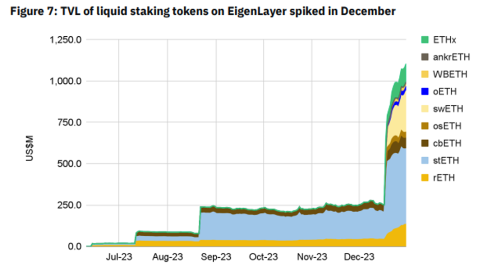 积弱已久的以太坊生态终于要迎来新一波叙事了,除了利好众多 L2 的坎昆升级( Den Cun upgrade)外,再质押的的风潮随着 EigenLayer 去年底开放增加 LST 抵押额度后成为以太坊生态的焦点,EigenLayer 在短短一个月内洪吸超过 50 万颗 $ETH TVL 突破 10 亿美元如今来到了 14 亿美元是目前以太坊 TVL 第 12 名的天王级项目,而首个使用 EigenLayer 验证服务的 AVS - EigenDA 也即将上线,DA 服务的叙事也跟着 Celestia 的代币 $TIA 暴涨而成为市场瞩目的话题,而 EigenLayer 不只自己独善其身,同时也带来了新的赛道 Liquid Restaking Defi (LRD)/ Liquid Restaking Token (LRT) 流动性再质押服务,顾名思义 LRD 的项目就是为了释放存在 EigenLayer 里的 LST(stETH, swETH, ETHx) 流动性,通过发放抵押凭证代币 (LRT) 来帮助用户释出流动性,形成新一轮的代币套娃。
