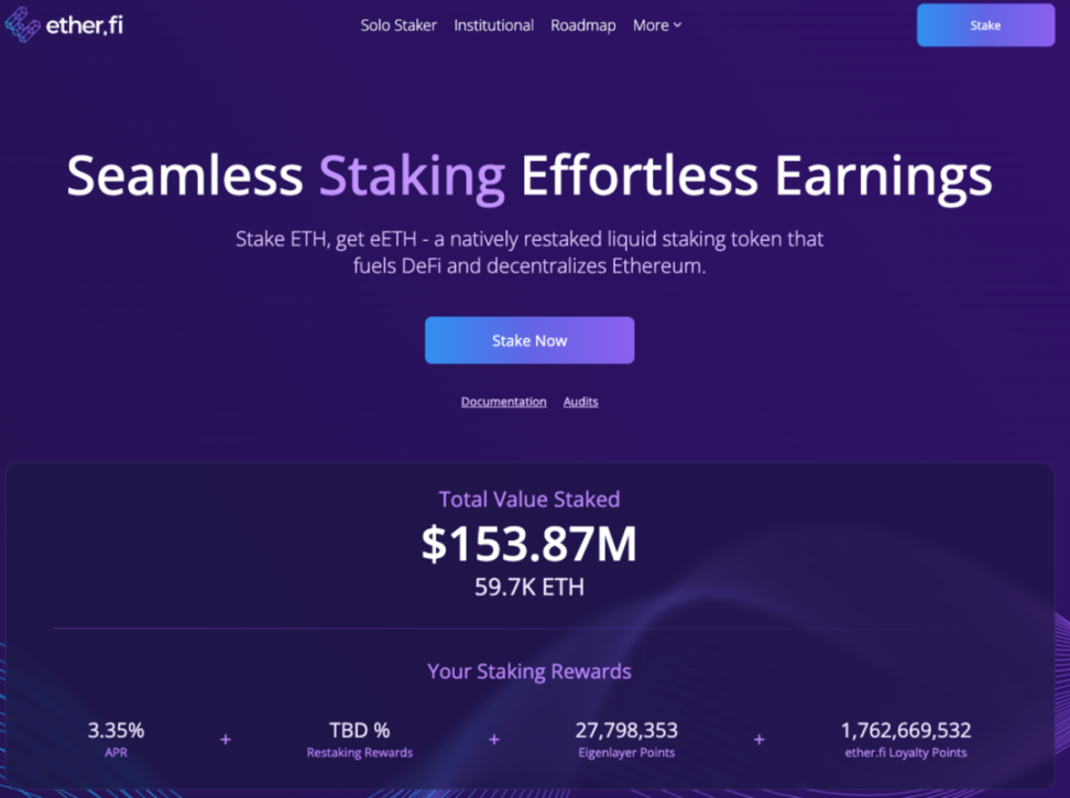 ether.fi 与上述两个项目相同,同样是 Liquid Native Restaking 类型的产品,曾获得 Bit MEX 创办人 Arthur Hayes 参投的 530 万美元种子轮融资,不同于 LIDO,ether.fi 采用了一种去中心化、非托管的方式来实现 ETH 的质押,并且宣布提供再质押服务,由于是原生 ETH 再质押,因此也不受到 EigenLayer LST 限额影响仍可以存入,而其抵押凭证代币 eETH ( 包装代币 weETH) 也是目前少数具有流动性的 LRT 抵押凭证代币。