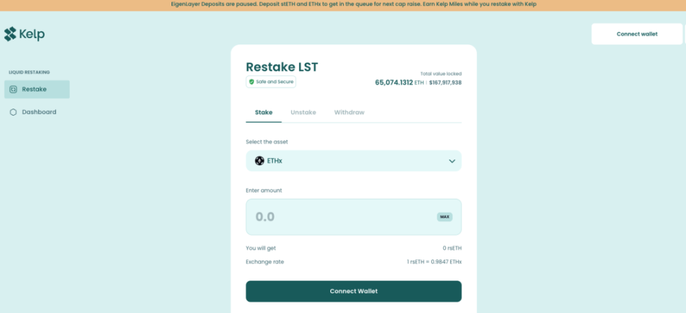 KelpDAO 是由 LSD 项目 Stader Lab 做的 Restaking 生态项目,如同上文所说的属于 Liquid-LSD Restaking 类型,目前开放存入 Lido 的 stETH 以及 Stader 的 ETHx 这两个 LST 代币,不过由于目前 EigenLayer LST 的额度已满因此目前是暂停存款的,另外官方也明确表示存入 KeplDAO 的用户将能够获得 EigenLayer 的积分奖励。目前协议 TVL 超过 160 M 是 LRT 领域 TVL 最高的项目。