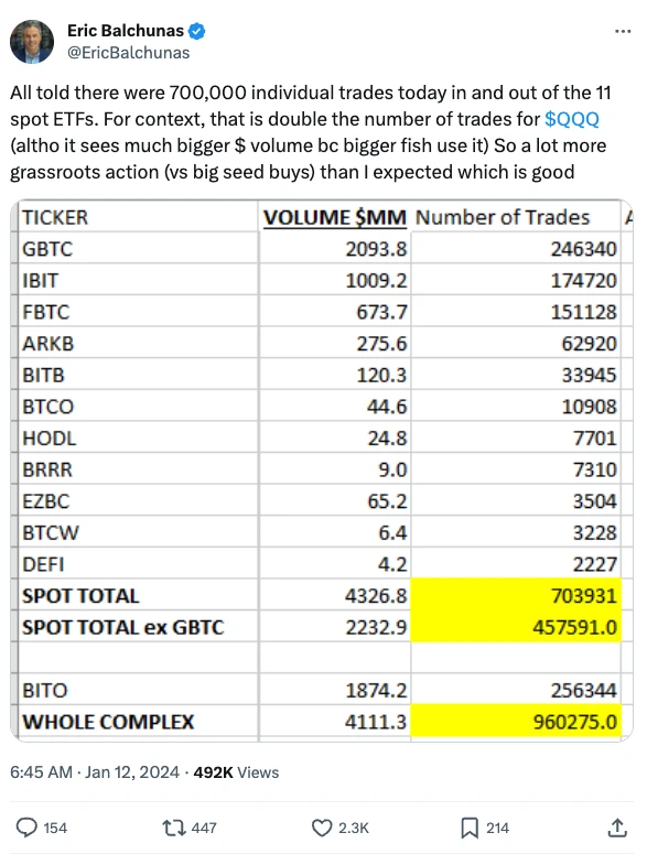 数字货币市场迎来了 BTC Spot ETF 获批后的首个交易日,根据彭博分析师 Eric Balchunas 在 Twitter 上分享的数据, 11 支上线的 ETF 总共累计了 70 万笔交易,成交额超过 43 亿美元,其中 Greyscale 旗下的 GBTC 占 20 亿,贝莱德的 IBIT 以 10 亿的份额紧随其后,第三则是 Fidelity 的 FBTC,交易量大约为 6.73 亿美元。值得注意的是,在这十一支 ETF 中,成交量第一的 GBTC 是从原来的“封闭型基金”转型现货 ETF 的,此等高额交易量的源头并不是全是因为大量资金涌入,相反,更有可能是因其高昂的管理费用以及负溢价问题缓解而引发的资金撤出转而流入其他新的 ETF。