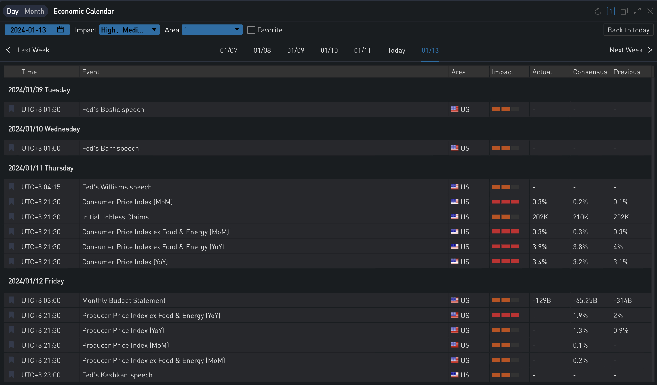 昨日(11 JAN)美国 12 月 CPI 年率录得 3.4% ,超过预期的 3.2% ,月率录得 0.3% ,同样略微高出预期;去掉能源和食品的核心 CPI 指数月率/年率分别录得 0.3% /3.9% (预期是 0.3% /3.8% )。债券市场在 CPI 数据发布过后立刻作出反应,十年期收益率短线一度升高回到 4% 以上。但美联储官员发表讲话后,交易员重新加大了对美联储今年降息的押注,美债收益率快速回吐所有涨幅,当前两年期/十年期收益率分别为 4.264% /3.984% 。美三大股指呈现 V 型走势,最终接近平收,数字货币概念股在 BTC ETF 上线的第一天集体大跌,CoinBase -6.7% ,Microstrategy -5.21% 。
