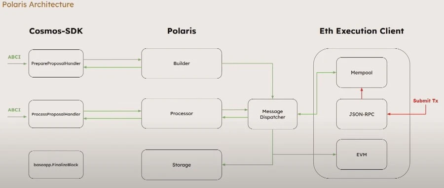 Berachain 基于 Polaris 构建,Polaris 是建立在 Cosmos SDK 基础上的 EVM 操作系统基板。Polaris 利用消息传递 "连接 "EVM 和 Cosmos SDK,将程序块的构建、处理和存储从执行本身中分离出来。
