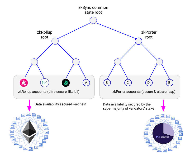 另外,在 Matter Labs 的设想中,zkPorter 上的账户可以与 ZK Rollup(zkSync Era)上的账户或合约无缝交互,从用户的角度来看,可能唯一明显的区别是 zkPorter 账户的费用会便宜很多倍。