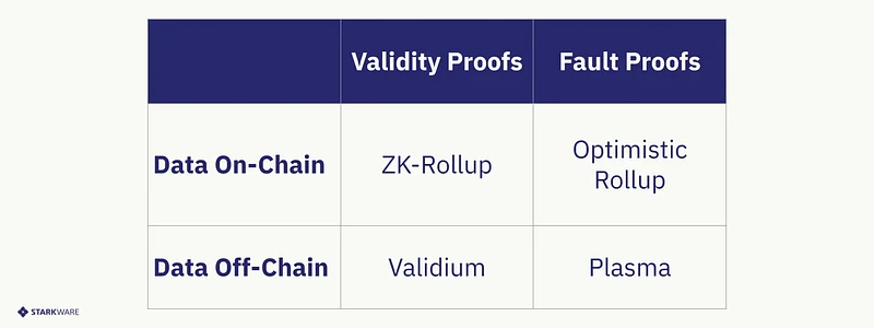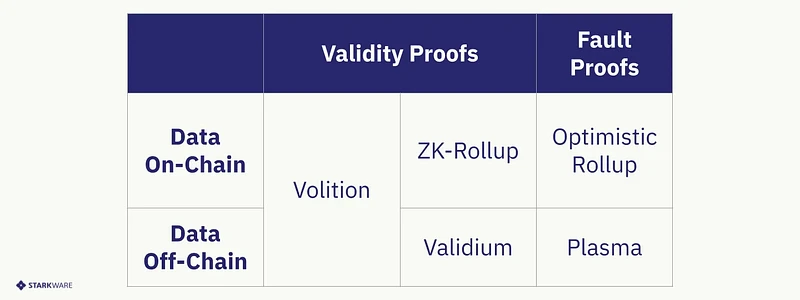 在以太坊最初探索的扩容方案中,使用有效性证明并将数据发布在链上的称为 ZK Rollup,同样使用有效性证明但将数据发布到链下的称为 Validium;使用欺诈证明并将数据发布在链上的称为 OP Rollup,同样使用欺诈证明但将数据发布到链下的则是 Plasma。