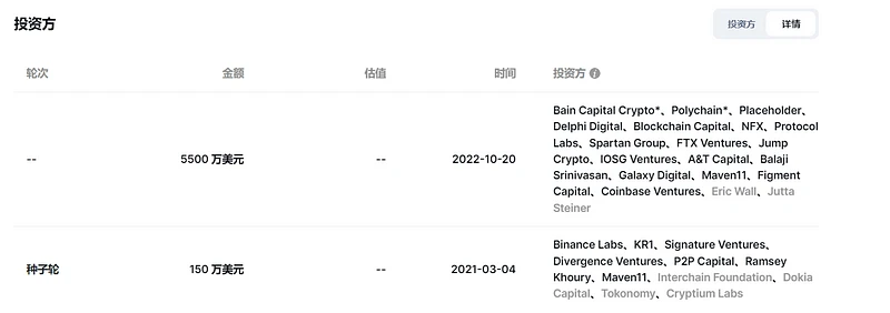 Celestia 先后完成了两轮融资,在 2021 年 3 月的种子轮中完成了 150 万美元的融资,在 2022 年 10 月的第二轮中完成了 5500 万美元的融资,多个知名 VC 参投。