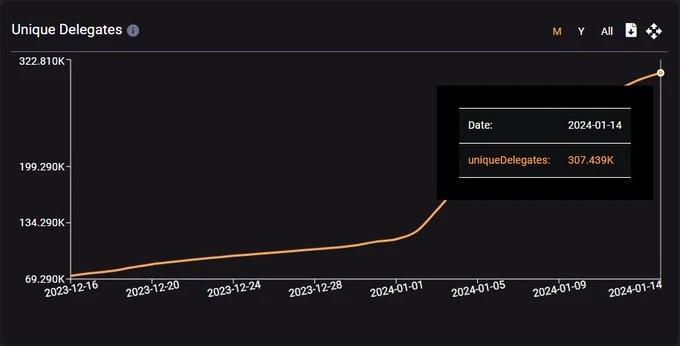 Smart Stake 数据显示,TIA 当前的全网质押率已达到 48% ,考虑到 TIA 创世才刚刚过去两个多月,这一数据已相当可观,甚至超过了许多老牌 PoS 网络(比如 35% 的 Polygon, 34% 的 Harmony ); 与此同时,质押 TIA 的独立地址数也在快速增长,截至 1 月 14 日已突破 30 万个。两项数据很直观地展现了当前 TIA 持有者的质押热情。