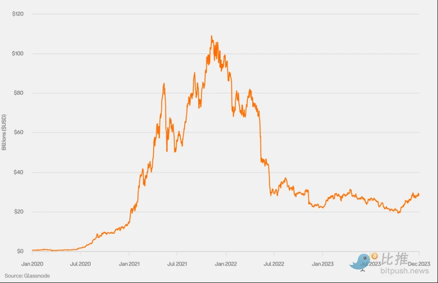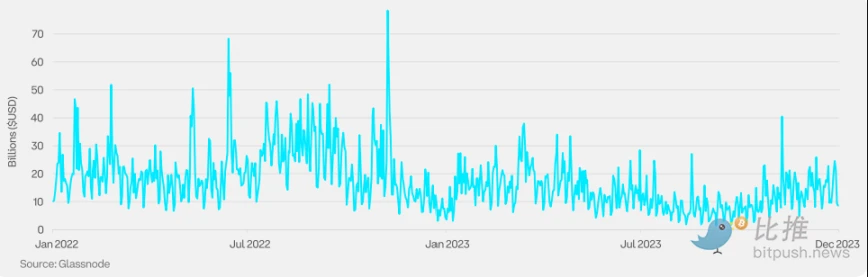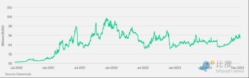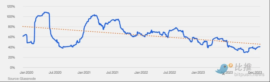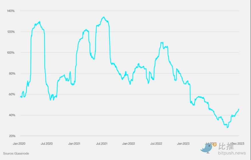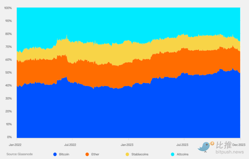 加密货币主导地位衡量的是特定加密货币的市值占所有加密货币总市值的百分比。2023 年,随着市场对比特币现货 ETF 批准前景日益看涨,以及资金向优质资产转移,比特币的主导地位有所上升。一些市场参与者还将 2024 年 4 月的比特币减半视为潜在的价格上涨催化剂。