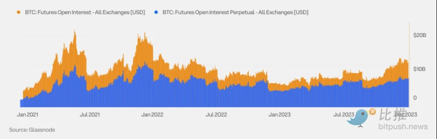 随着机构投资者越来越多地进入这一领域, 2023 年期权未平仓合约有所增加。2023 年 10 月,BTC 期权的未平仓合约首次超过 BTC 期货。