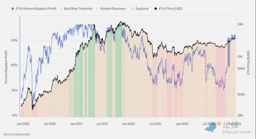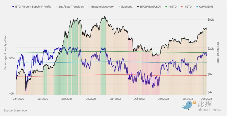牛熊过渡阶段:这是底部发现阶段和狂热阶段之间的过渡时期,此时供应量的盈利状态更接近均衡(盈利供应量百分比介于 55% 和 95% 之间)。
