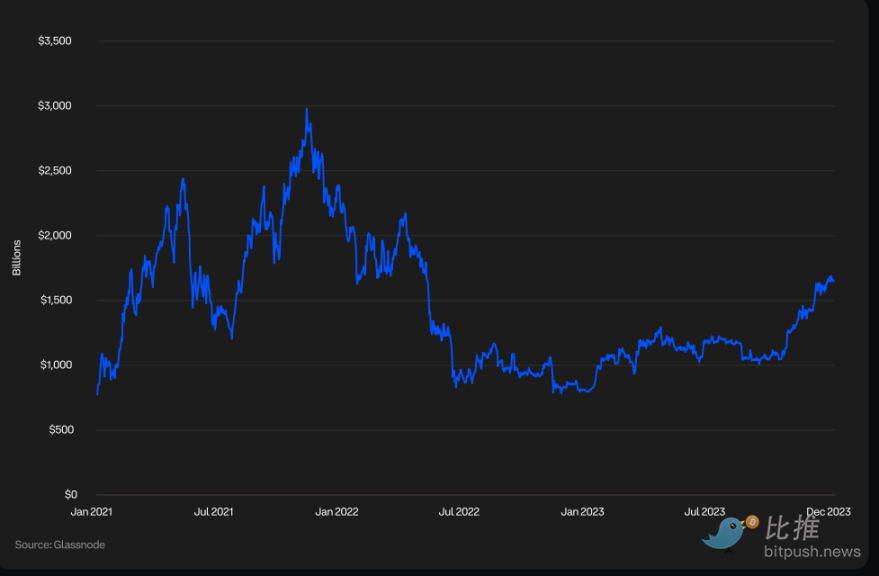 加密货币总市值是反映全球数字资产市场价值的重要指标,涵盖了比特币(BTC)、以太坊(ETH)、代币和稳定币等。2023 年,在比特币和以太坊的强劲表现带动下,加密货币总市值增长超过了 108% 。