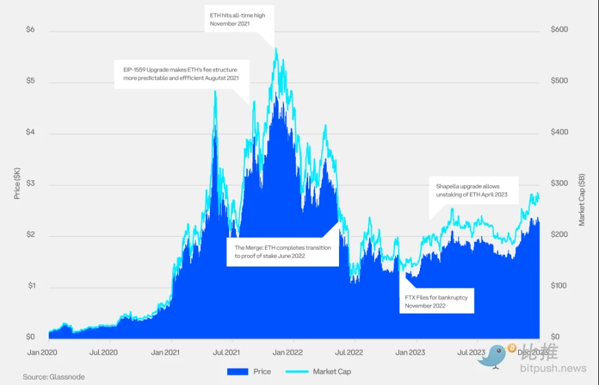 2023 年,以太坊(ETH)价格上涨超 90% ,这得益于 Shapella 升级的成功以及加密货币现货交易型开放式指数基金(ETF)获批前景的日益明朗,市场参与者备受鼓舞。