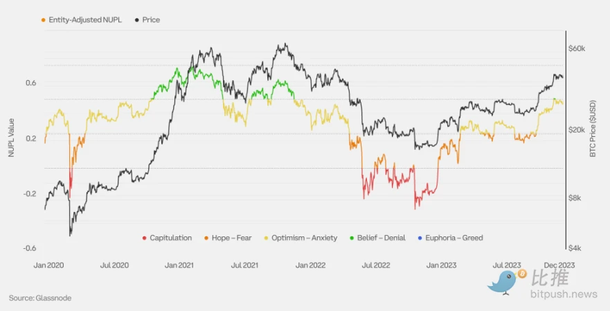 比特币实体持有调整后的净未实现盈亏(NUPL)