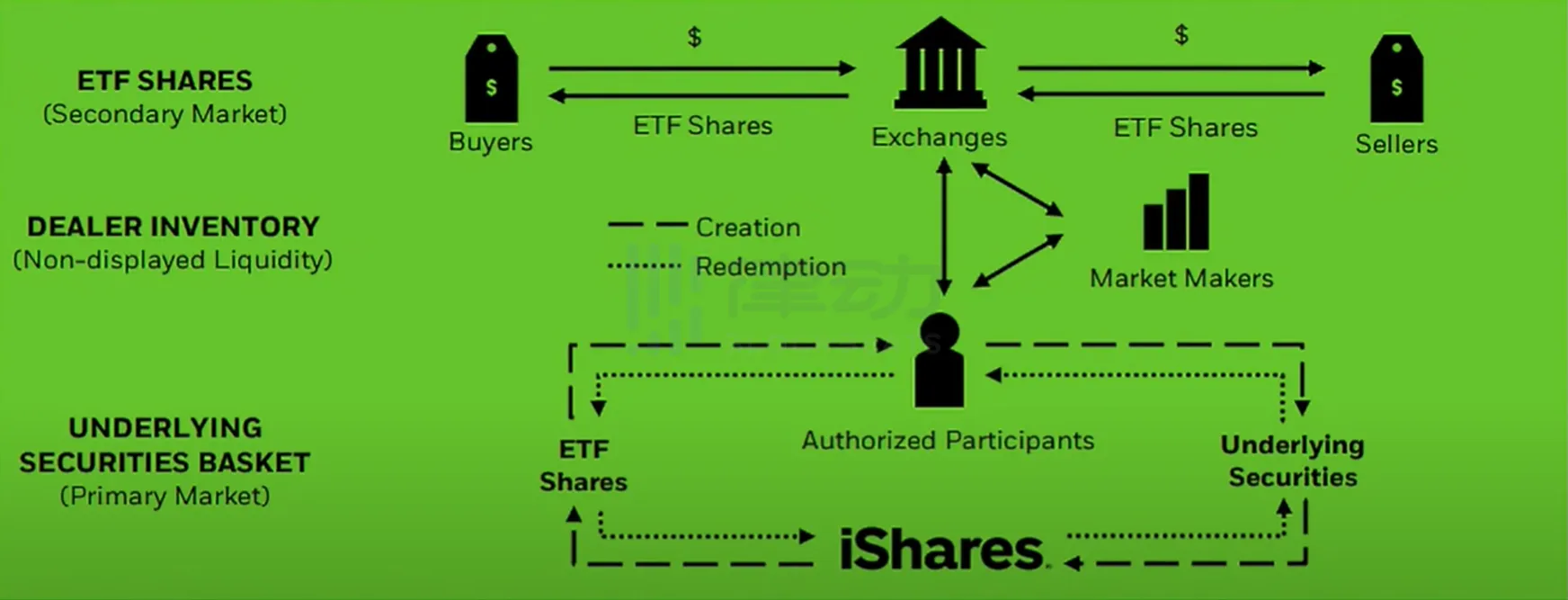 其中,参与者包括,ETF 的管理公司,同时也叫做「sponsor」,如图中的 iShares;市场的投资者,比如散户和机构;MM(做市商)和 AP。AP 往往是一个机构,比如说银行,他和 MM 在图上显示为两个不同的参与者,但在现实世界中可以是同一个机构。