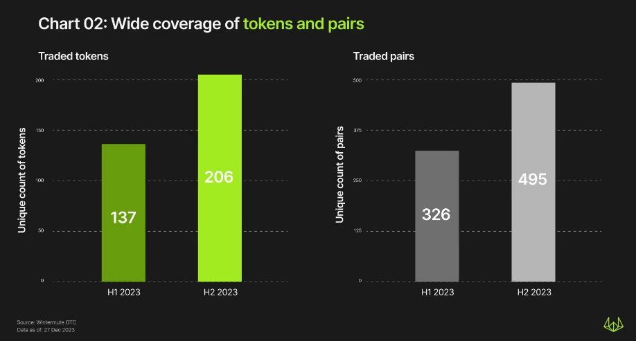 2023 年 Wintermute 为 206 种资产和 495 个交易对提供 OTC 交易。以下为 Wintermute 所观察到的整体资产交易趋势。