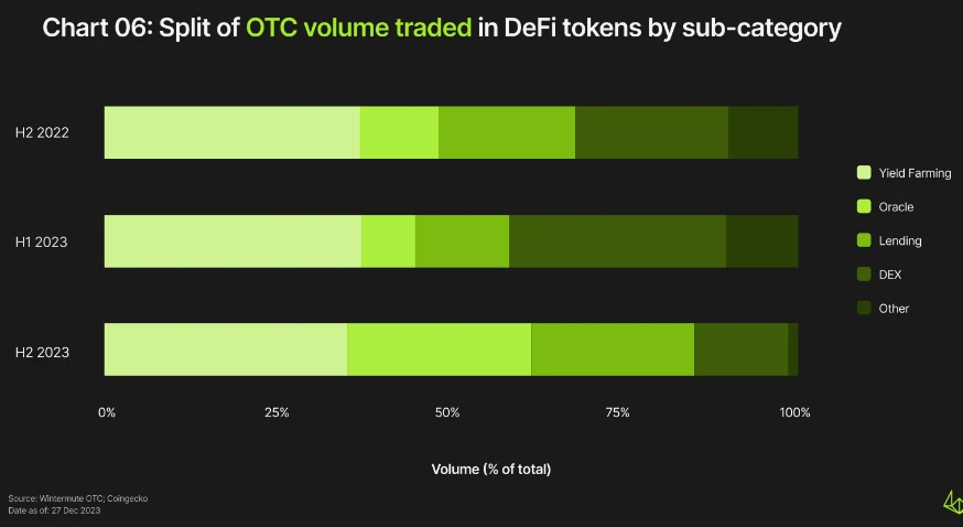 虽然从 2022 年下半年到 2023 年下半年,DeFi 的义交易量增长了约 7 倍,但市场份额从 16% 降至 11% 。 在 DeFi 中,Yield Farming 的交易量最大,其次是预言机、借贷和 DEX 资产。