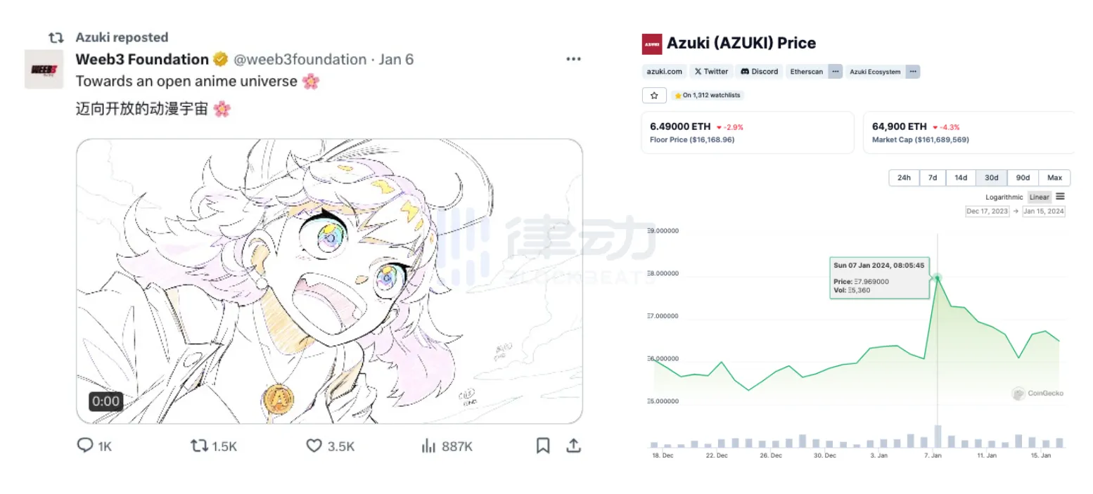 有利好消息支撑的 NFT 系列也难逃影响。Azuki 官方推特账号曾在 1 月 5 号转发了 Weeb 3 Foundation 的一条推文,社区因此猜测其可能会发行名为 ANIME 的代币,这使 Azuki 的地板价在两日间上涨超 30% 、一度飙升至 8 ETH 左右。但 Azuki 没能抵挡住被抛售带来的影响,自 1 月 7 日后,Azuki 地板价开始走下坡路,并在 1 月 13 日回落至 6 ETH。