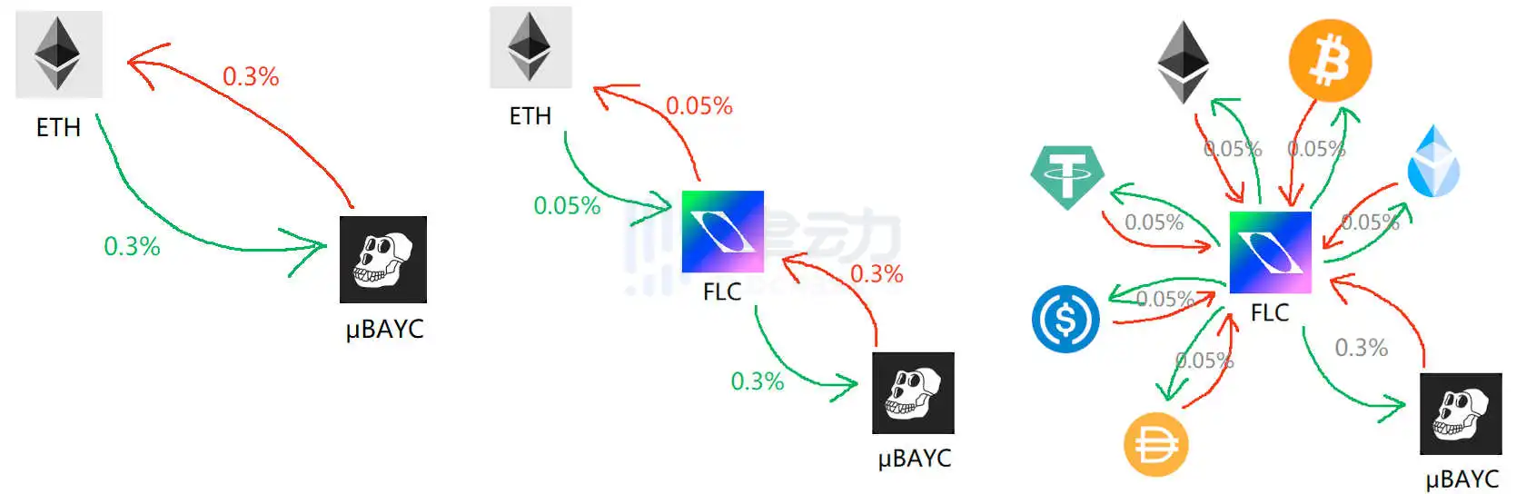 µToken 是代表 NFT 碎片化后价值的代币,用户将 NFT 存入 Flooring Protocol,获得相应 NFT 所代表的μToken。在机制更新之前,用户仅能通过 Flooring Protocol 在 Uniswap 的 ETH 和μToken 的交易对间进行交易。而引入µToken/FLC 交易对后,用户对 FLC 的交易操作将直接影响µToken 的价格。在 Flooring Protocol 上交易时,Uniswap 上的最佳交换路线将是 ETH -> FLC -> µBAYC。