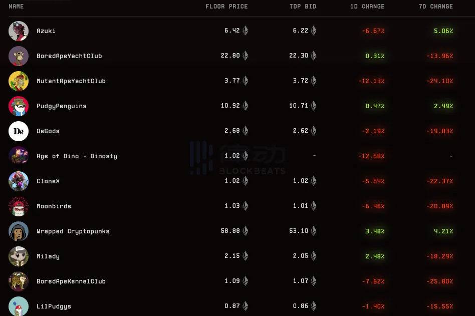 蓝筹 NFT 的价格波动带动了整个 NFT 市场,据 Blur 数据,截至 1 月 12 日,许多 NFT 系列的 7 日内跌幅在 10% -25% 之间,NFT 市场似乎出现了普跌行情。