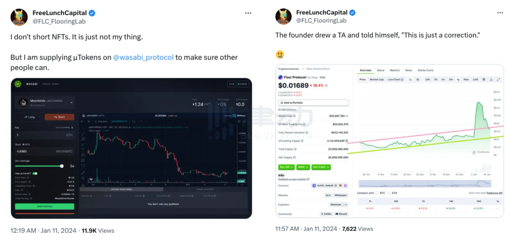 在 FLC 与 NFT 市场的双双「崩盘」后,Flooring Protocol 创始人在 1 月 11 日连发两条推特,作为对 NFT 和 FLC 波动情况的回应。「我没有做空 NFT」,Flooring Protocol 创始人表示 NFT 的下跌与自己无关,同时再次介绍了正与 NFT 期权协议 Wasabi Protocol 进行的合作,「但我正在为 Wasabi Protocol 提供µToken,其他人会借此做空。」对于 FLC 暴涨又暴跌的走势,Flooring Protocol 创始人则表现出略带自嘲的态度,「这只是一个修正」。