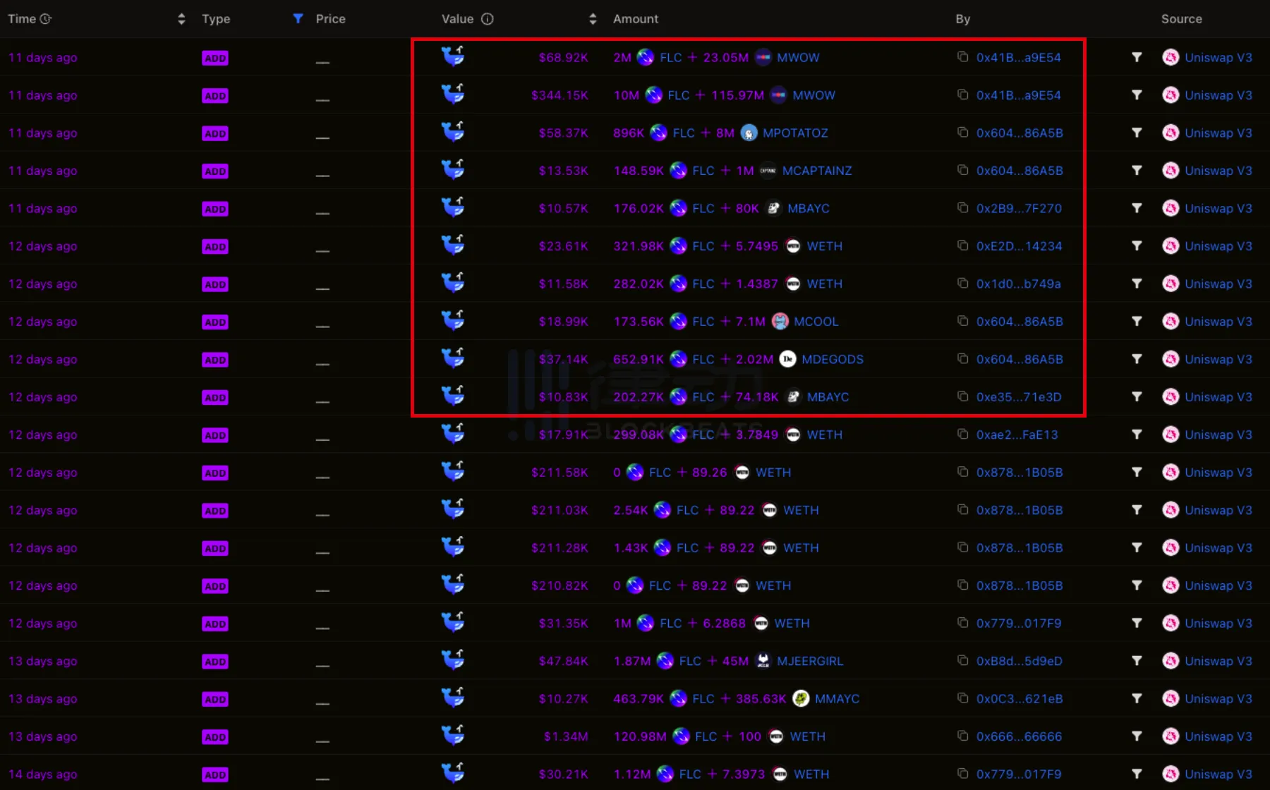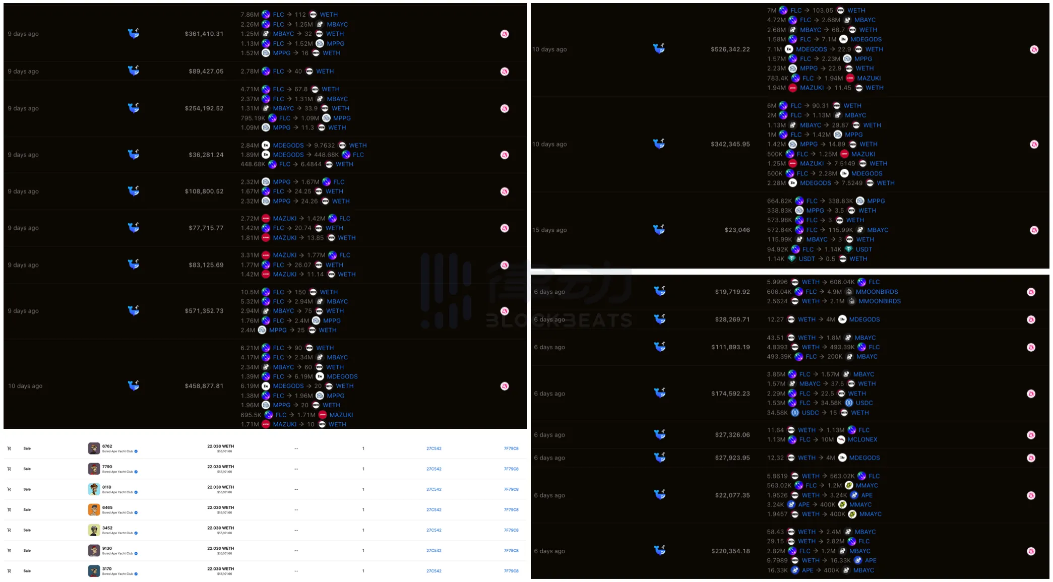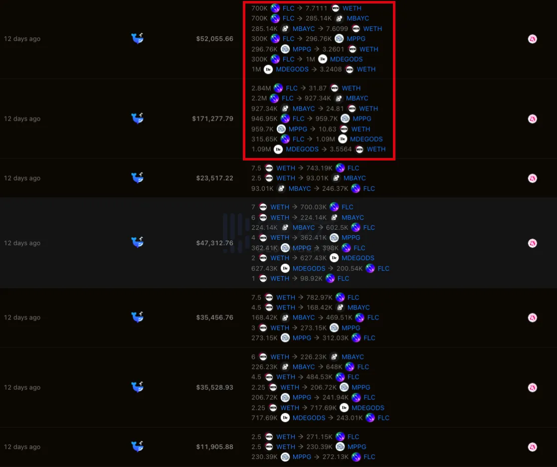 部分流动性提供者,比如以 0x 27 开头和以 0x F 6 开头的地址从 1 月 5 日开始,用其所持有的 FLC 兑换 BAYC、Azuki、DeGods 等蓝筹 NFT,在 Blur 和 Opensea 等平台抛售。