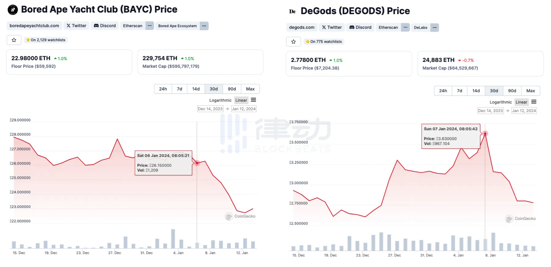 用了半个月时间,地板价从 2.60 ETH 爬升至 3.63 ETH 的 DeGods,在 7 号后开启了断崖式下跌,地板价不到一周跌去了 27% 。