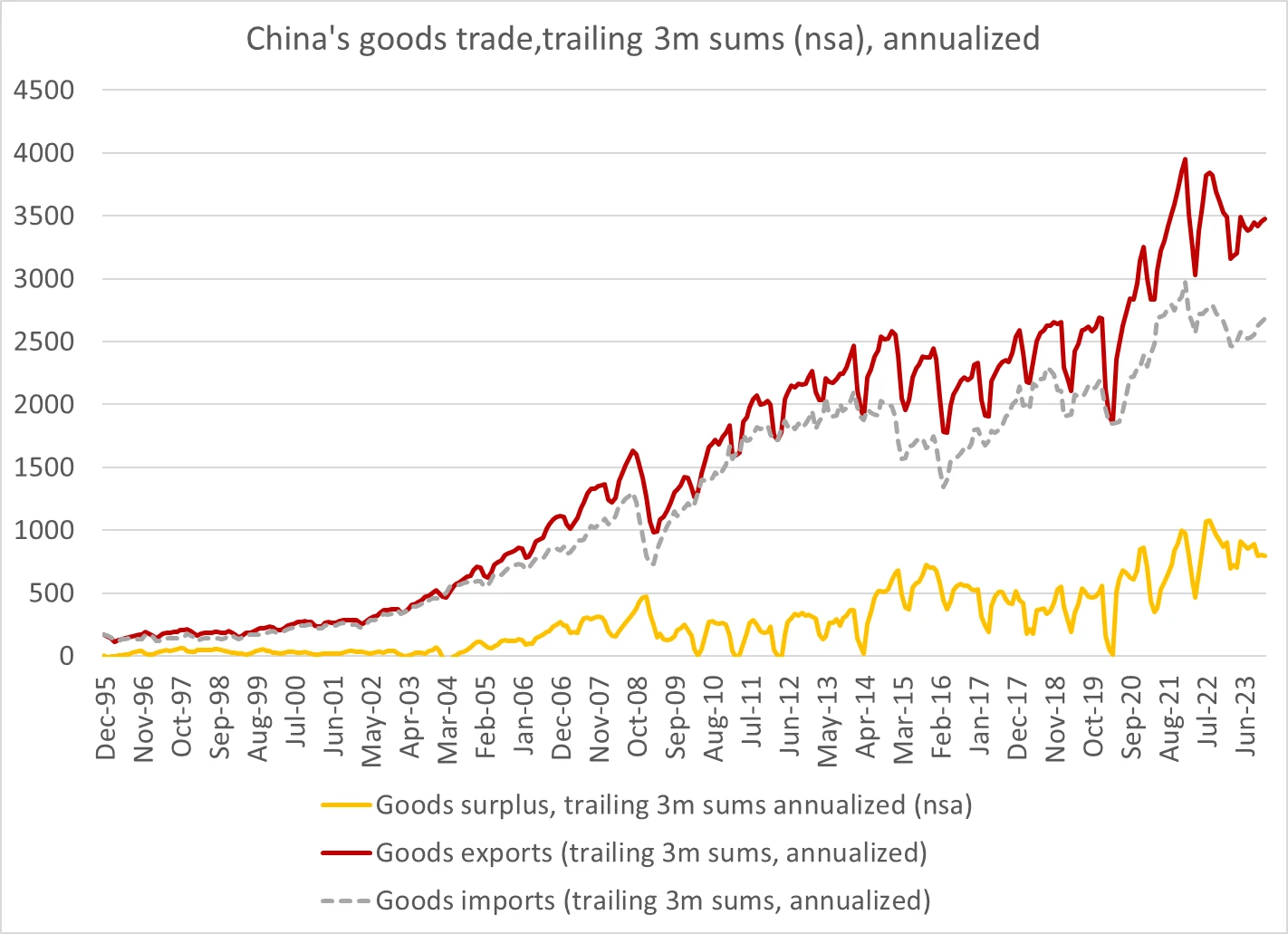 去年中国的进口也下降了 5.5% ,降至 2.56 万亿美元。这使得中国 2023 全出现了 8230 亿美元的贸易顺差基本与前年的历史高点一致。