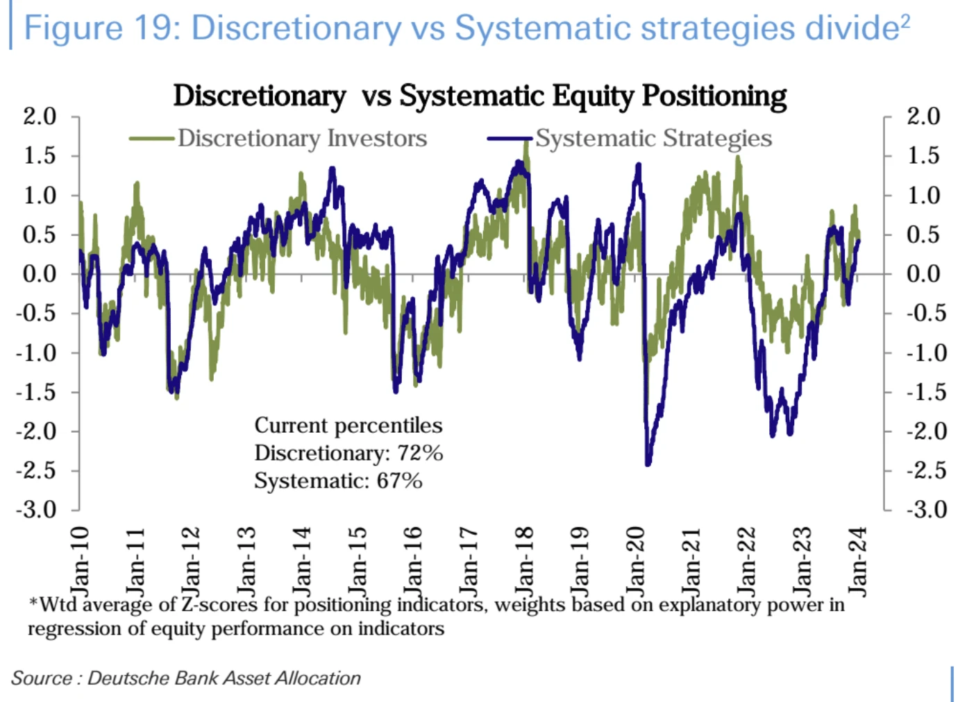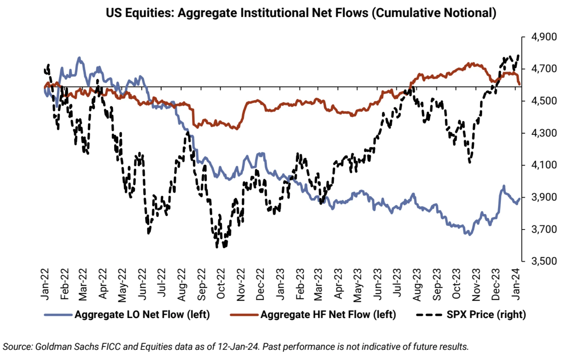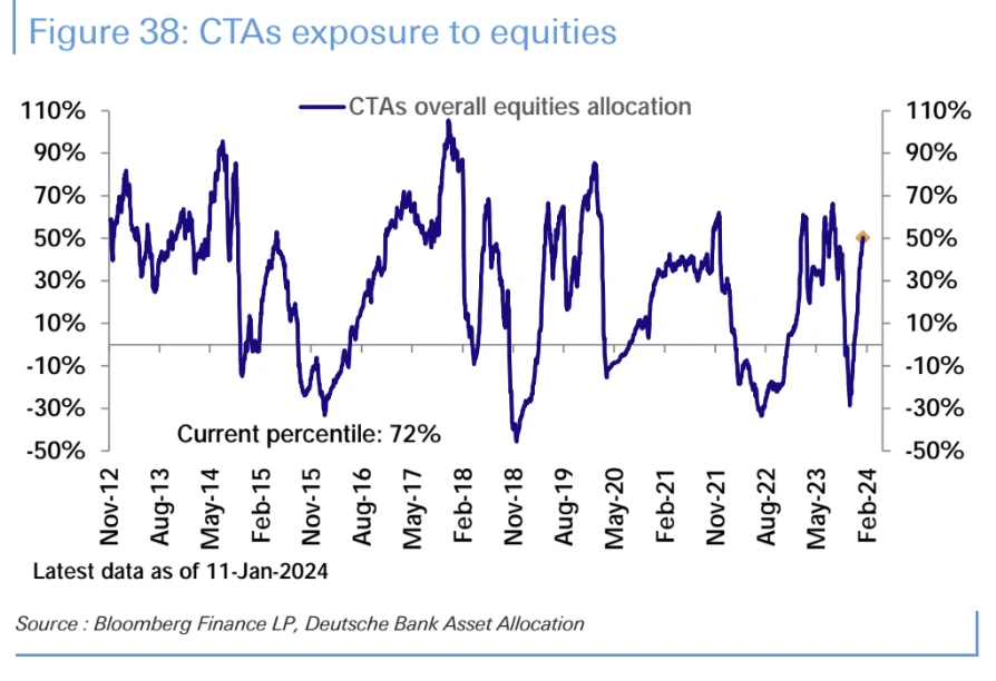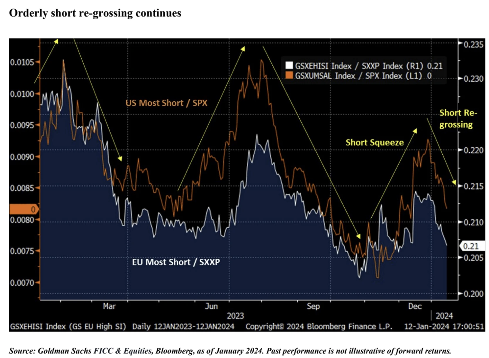 美股市场上周算是假期之后全面复工的第一周,市场转为乐观,标普涨 1.7% ,周五创下历史新高,纳斯达克涨 2.9% 。除了日本和印度外,亚太地区大部分股市下跌。强烈地震和乏善可陈的工资增长数据迫使市场参与者重新评估日银何时会将其货币政策正常化,日股大涨 6% 。欧洲 Stoxx 600 指数上涨约 0.8% ,如果能够维持,这将是自 12 月中旬以来的最大涨幅。宏观主题上降息概念已经过时,QT 缩减成为新的热点。因为再前一周我们观察到机构普遍看跌,尽管回调没有发生,但援引高盛交易台周末观点:我们认为有序的短期风险规避策略仍然有效。