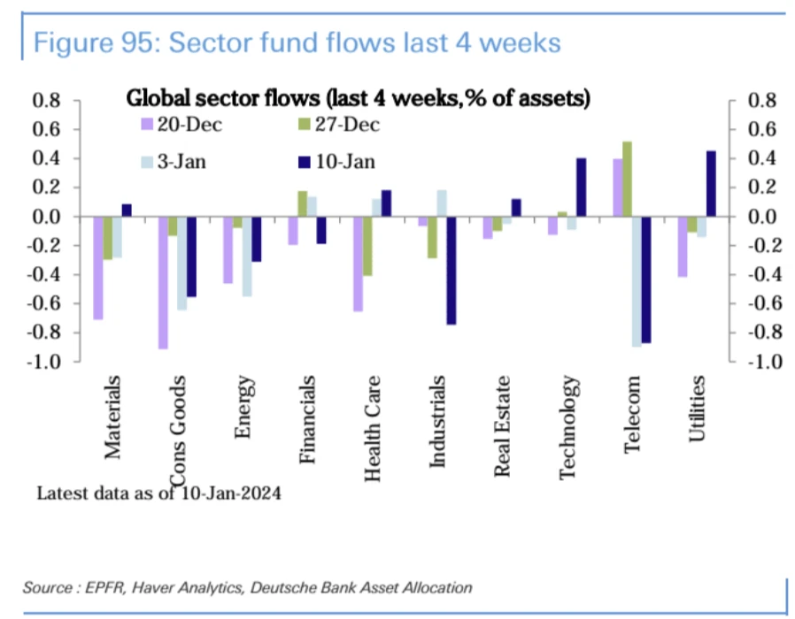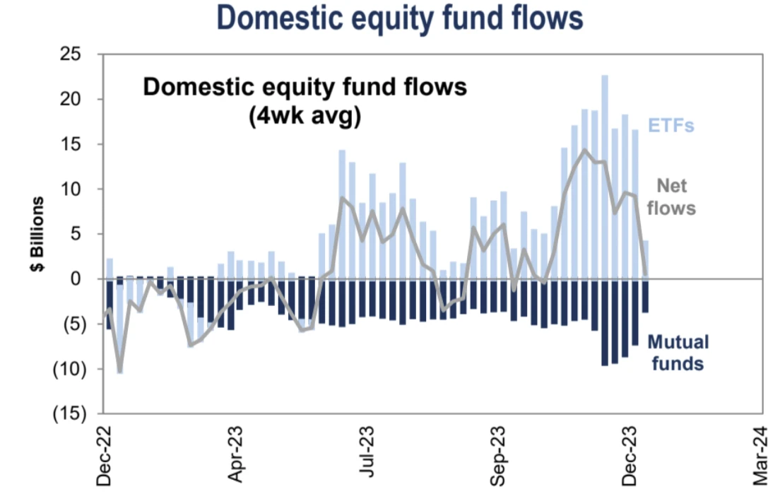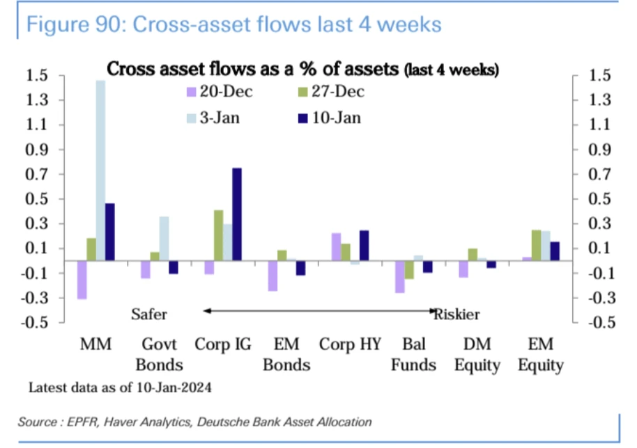 债券基金( 139 亿美元)的流入进一步加速至 9 个月来的最高点,这在很大程度上是因为投资级别债券( 72 亿美元)的流入跃升至 2020 年 6 月以来的最高水平,而国债基金资金流出。货币市场基金(+ 397 亿美元)收到了另一周强劲的流入,尽管比上周慢,但 2024 年前两周流入 1, 630 亿美元是有记录以来最强劲的年初: