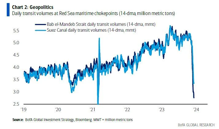 过去 4 周通过红海/苏伊士运河的运输量下降了 35 – 45% :