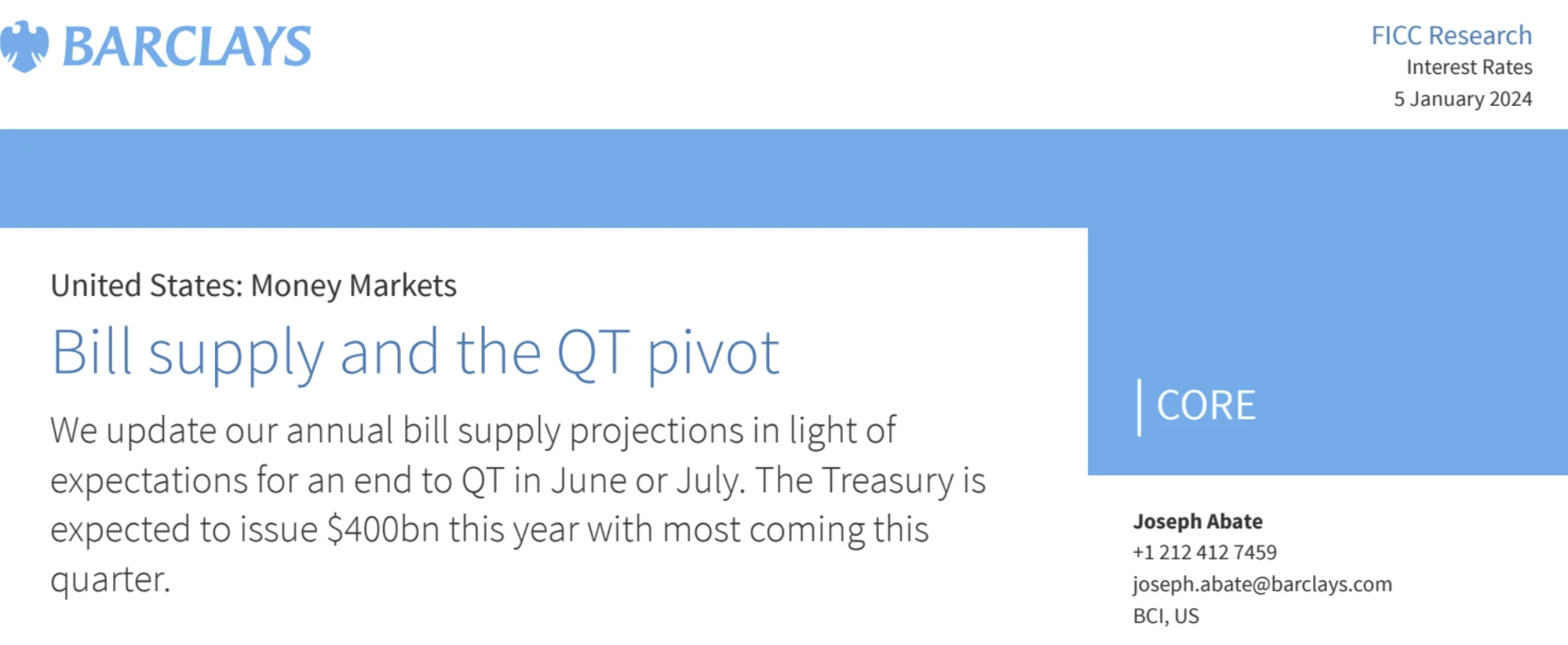 巴克莱 Joseph Abate 预计 Fed 已经有了之前的忌惮,本次在任何金融指标出现紧张迹象之前,就将终止 QT,预计 QT 将在 6 月或 7 月结束。