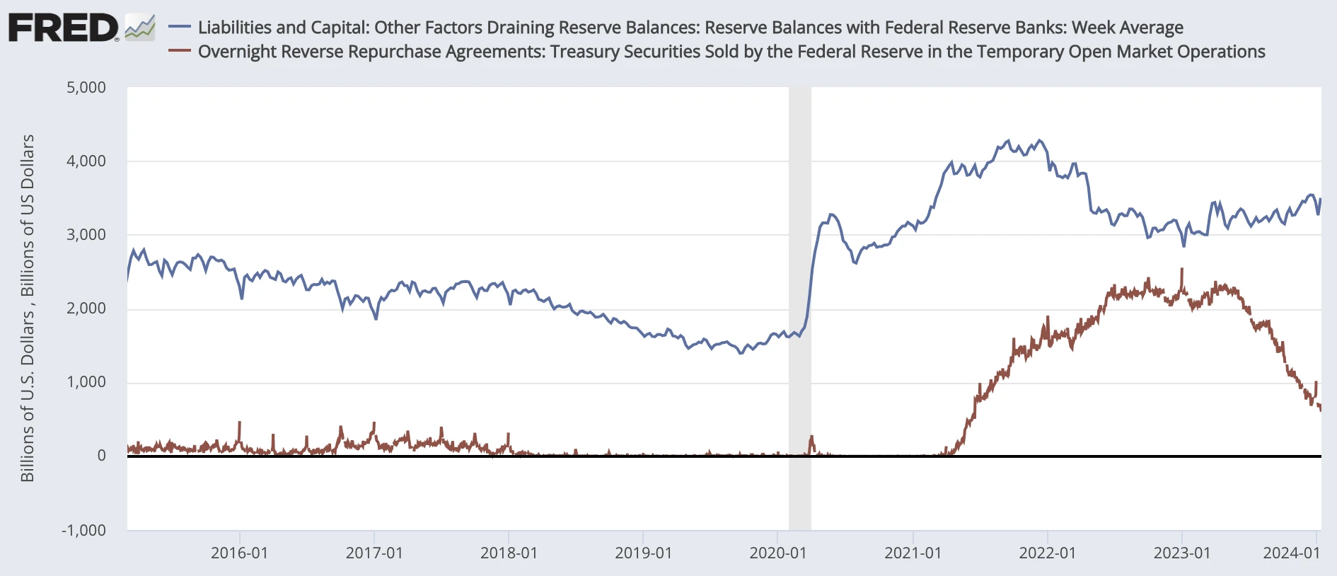 按照当前的下降趋势(一周-900 亿)ONRRP 最快到 3 月就可能归零。值得注意的是,虽然 Fed 虽然 2023 缩表了 1.3 万亿美元,但银行准备金余额实际上增加了 3500 亿美元,达到 3.5 万亿美元左右。这是因为 ON RRP 工具余额的减少进行了对冲。美国国债发行量的增加和利率路径的不确定性降低,促使货币市场基金更多地投资于国债,从而导致 ON RRP 迅速流失。