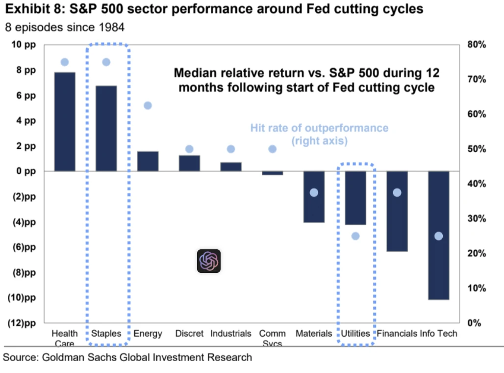 这个图表展示了自 1984 年以来,在美联储降息周期开始后的 12 个月内,各个行业板块相对于标普 500 指数的中位相对回报,以及超越标普 500 指数的频率:
