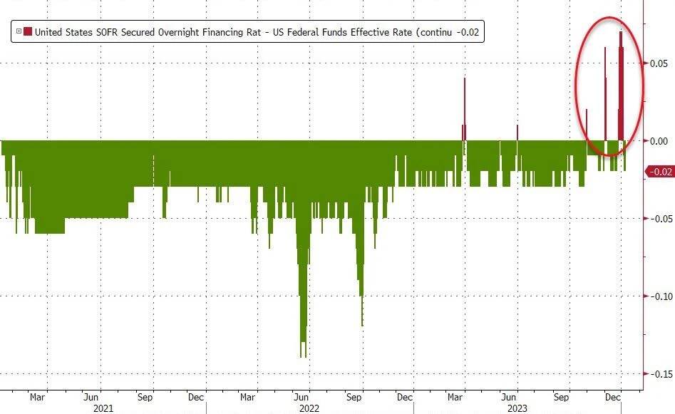 另外月末 sofr 和基准利率 spread 越来越来大也被认为是流动性紧张的表现: