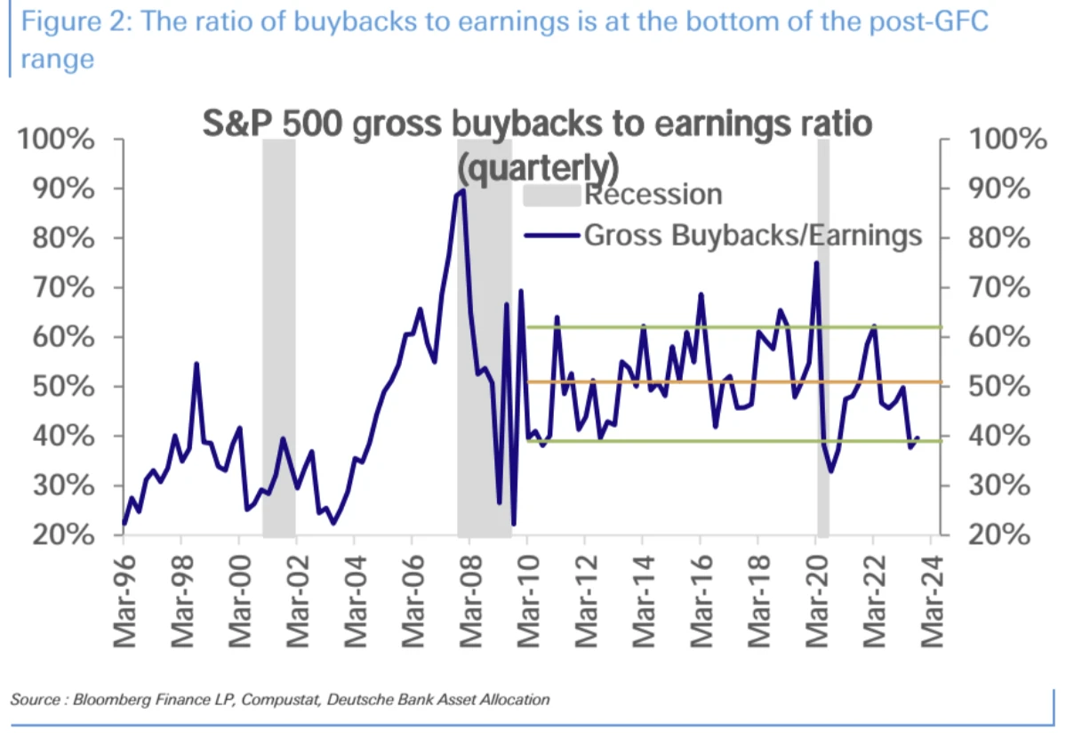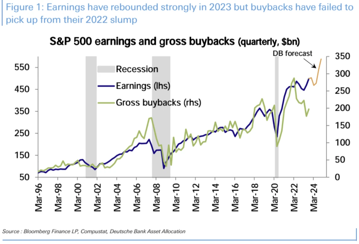 股票回购一直是美国股票最大的买家力量之一,历来与盈利高度相关。但 2022 年以来,尽管公司盈利重新创高,但回购额却未见明显反弹,仍远低于历史平均水平。