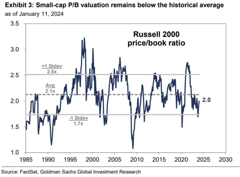 罗素 2000 指数的 2.0 倍市净率仍低于 40 年平均的 2.1 倍和 10 年平均的 2.2 倍。市盈率对罗素 2000 指数来说不那么有用,因为大约 1/3 的成分股是亏损的: