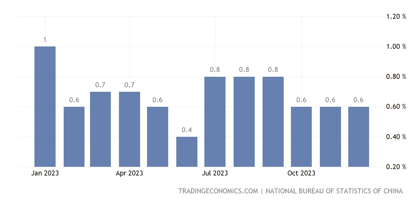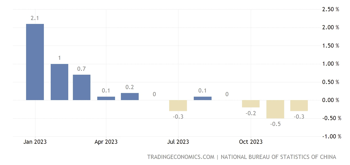 中国 12 月反映通胀的消费物价指数(CPI)同比收缩 0.3% ,为连续三个月陷入通缩。按全年计,中国 CPI 上涨 0.2% ,远低于国务院预期的 3% ,亦是中国自 2009 年以来最低的通胀率。与此同时,反映生产成本的生产者物价指数(PPI)更大跌 3% 。不过 CPI 的负贡献主要与食品有关,去除能源食品的核心通胀仍保持稳定。分析普遍认为人民银行可能很快会推出更多宽松措施,包括降息和降准。目前为止,被动的政策宽松未能抵消住房和地方政府融资平台去杠杆带来的强劲紧缩效应,构成了事实上的财政紧缩,也成为中国经济的下行压力。
