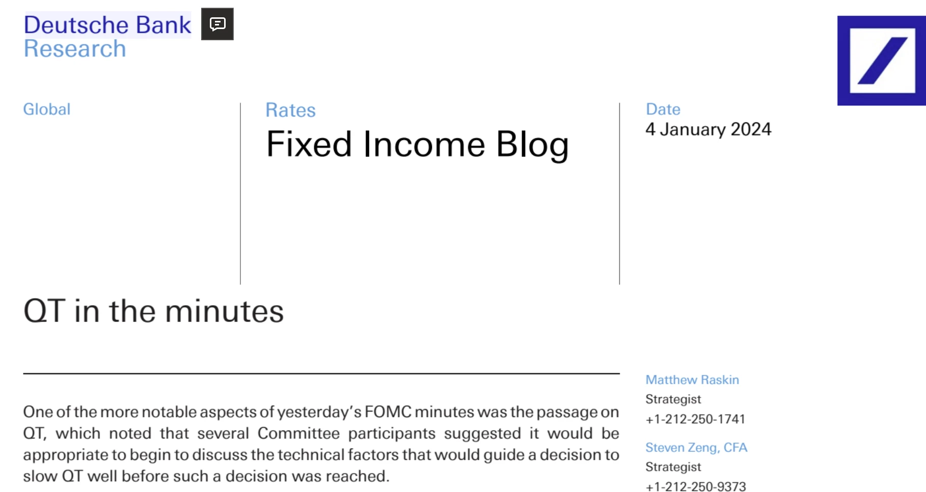 德意志银行预计今年 3 月第一次降息,然后 6 月开始削减 QT,但如果经济软着陆的话,到 2025 年 1 一季度才会完全停止。